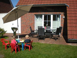 Der Außenbereich des Hauses verfügt über eine Terasse, die direkt über den Wohnbereich zu erreichen ist. Für schöne Tage haben wir einen Gartentisch mit Stühlen, einen Sonnenschirm und einen Grill. Zudem gibt es auch noch eine kleine Grünfläche.