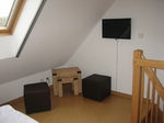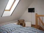 Über eine Treppe kommen Sie direkt in den ausgebauten Spitzboden, wo Sie zwei weitere Schlafplätze finden. Auch hier verfügen die Fenster über Jalousien und Fliegenschutzgitter, zudem gibt es hier eine kleine Sitzgelegenheit und einen Fernseher.